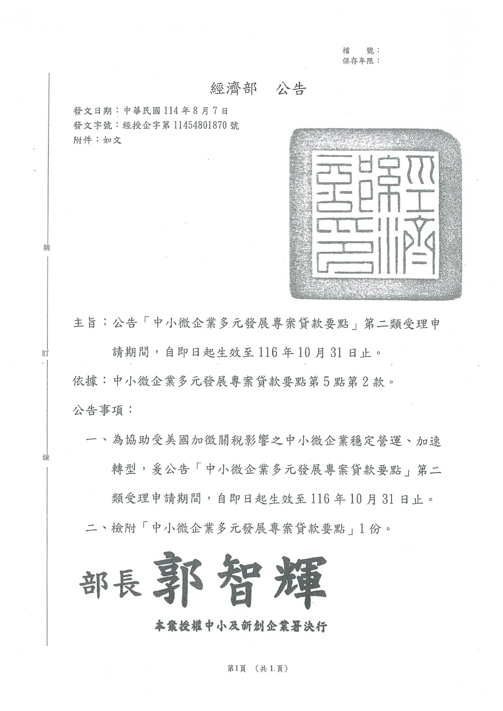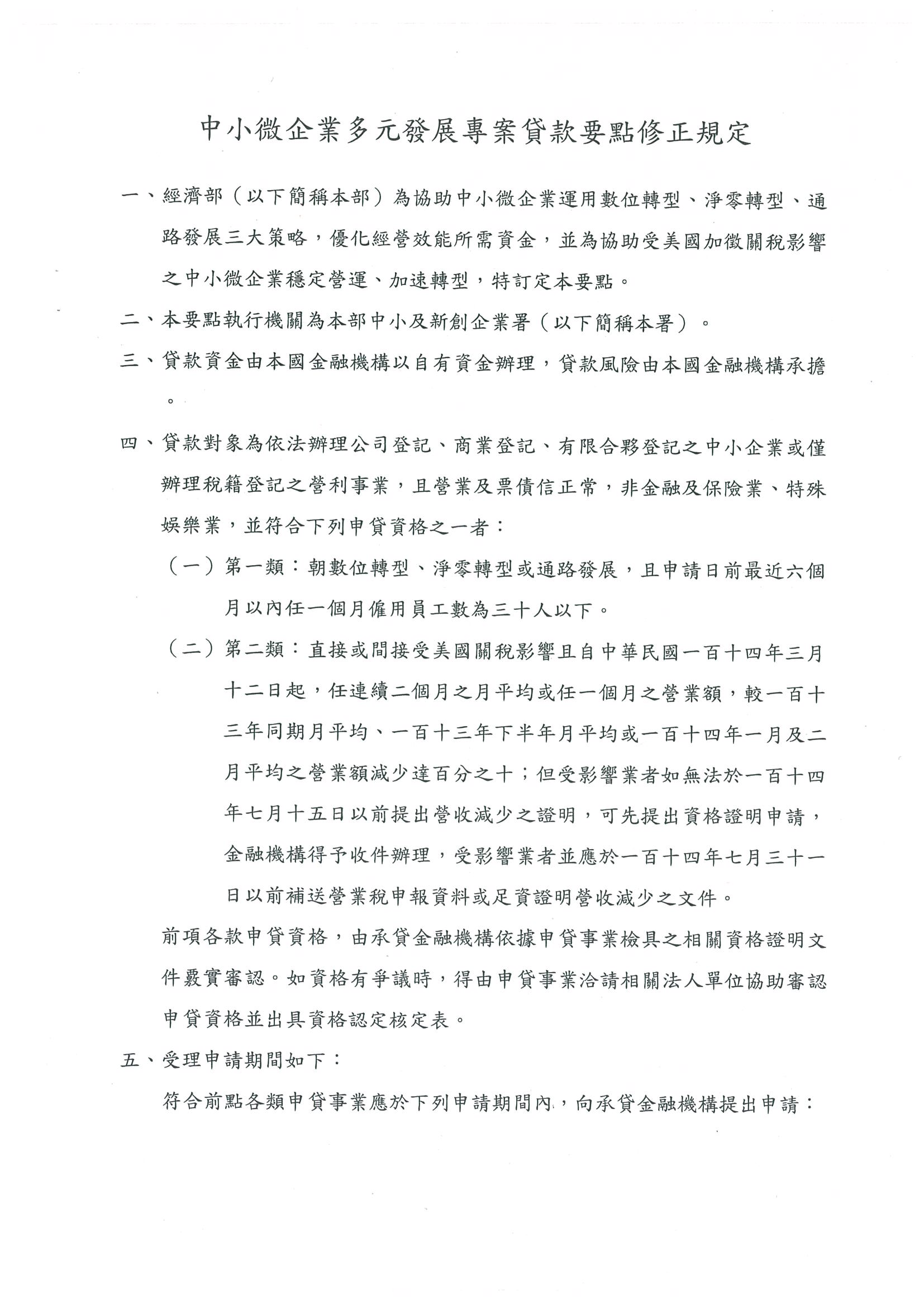 至116年10月31日止 經濟部公告受理【中小微企業多元發展專案貸款要點】