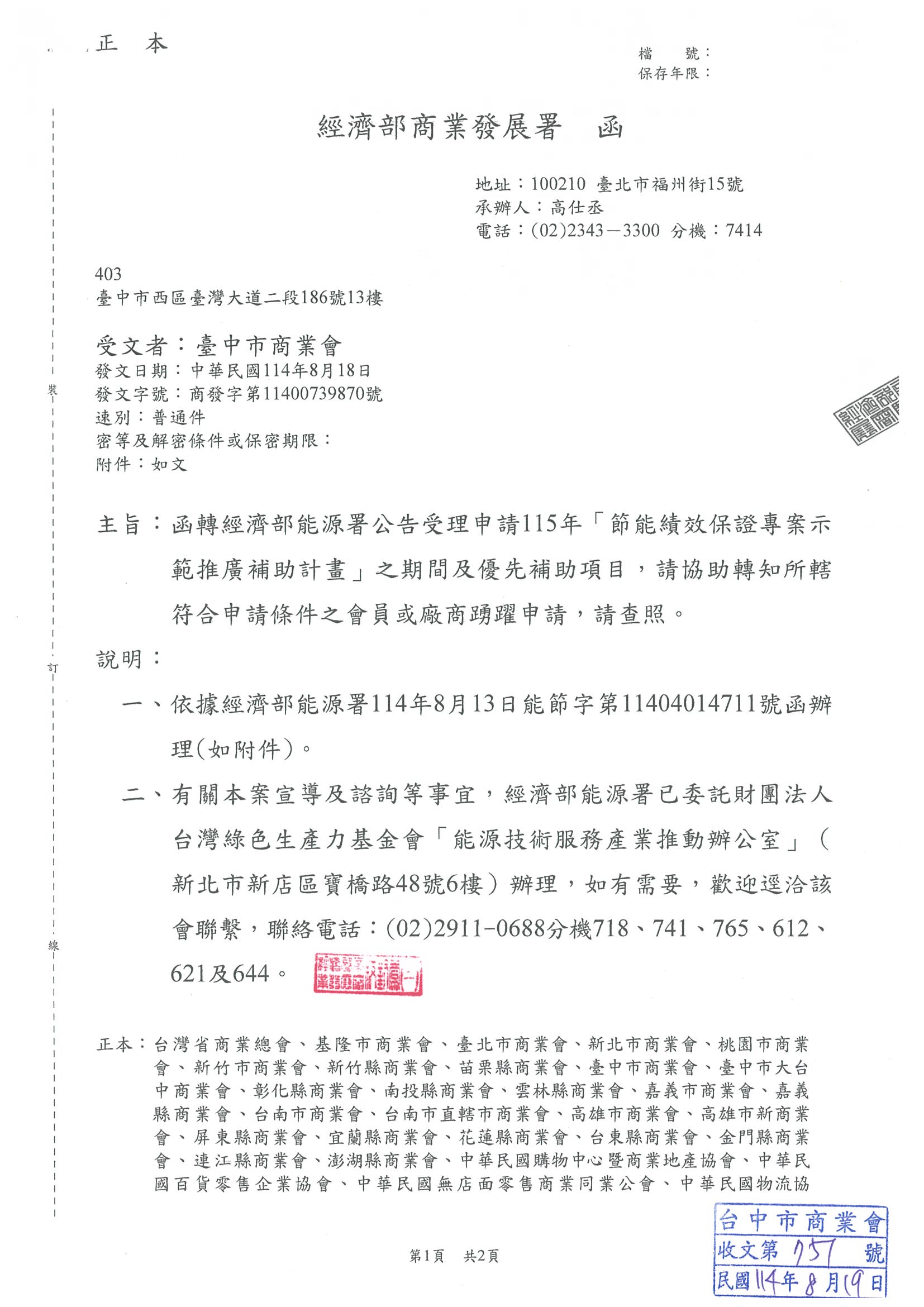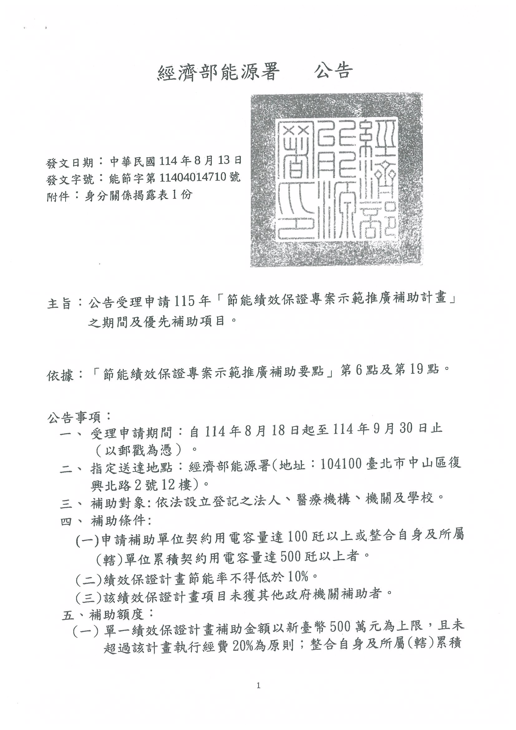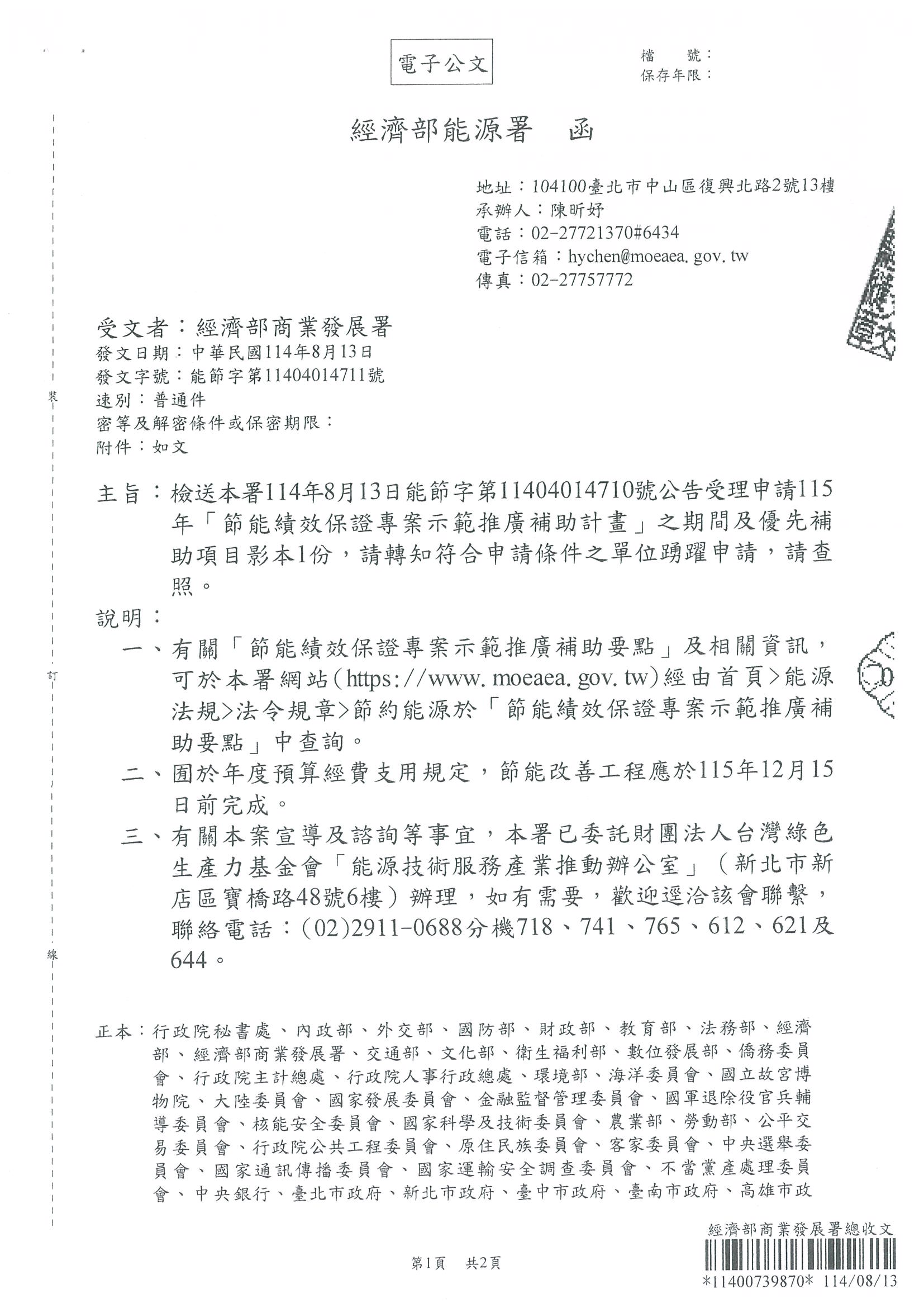 至114年9月30日止 能源署受理申請【115年節能績效保證專案示範推廣補肋計畫】