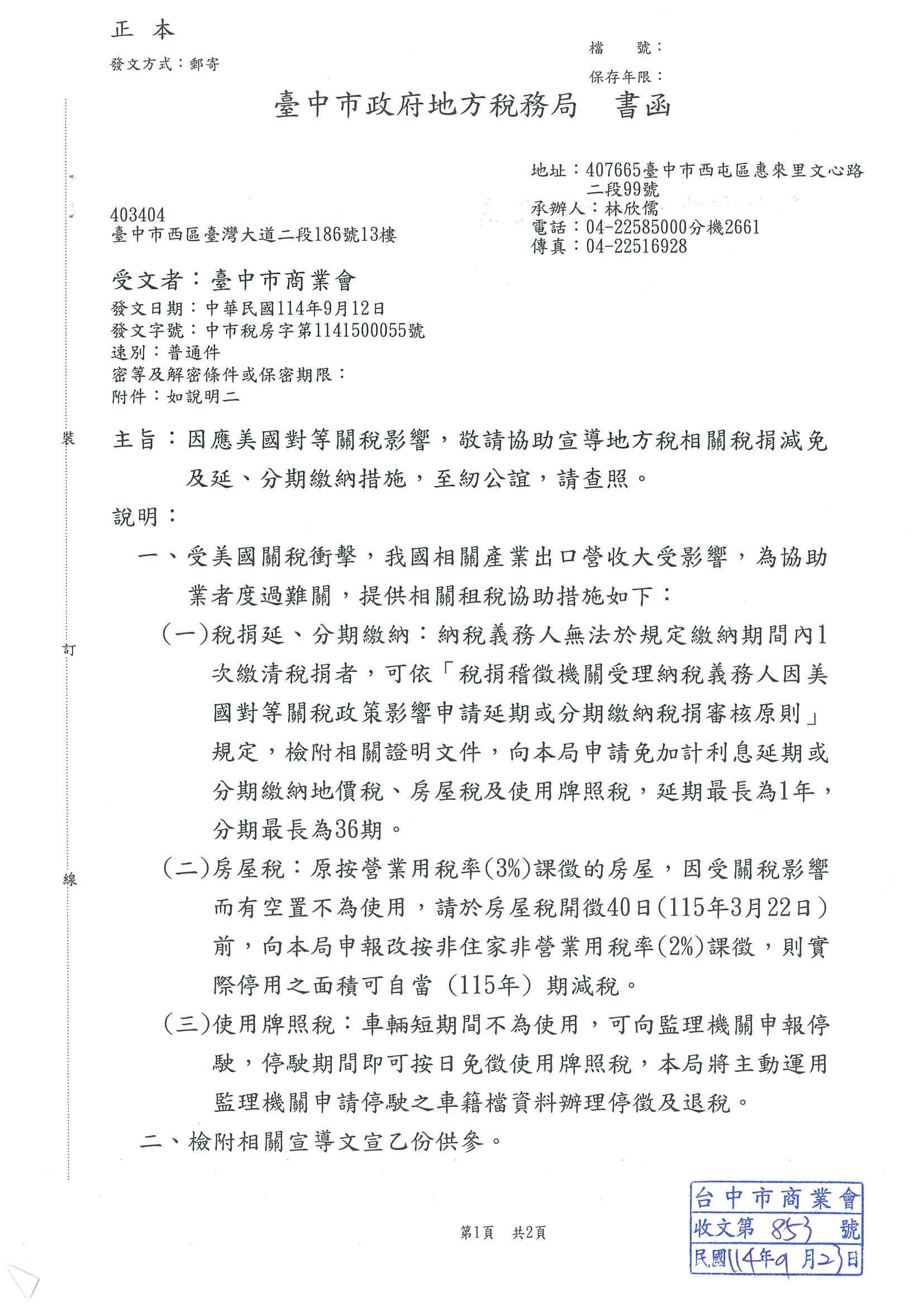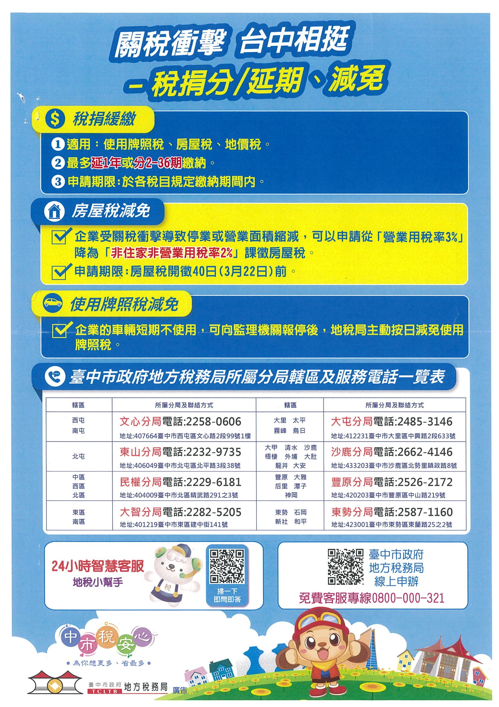 地方稅務局為因應美國等關稅影響,相關稅捐減免及延、分期繳納措施
