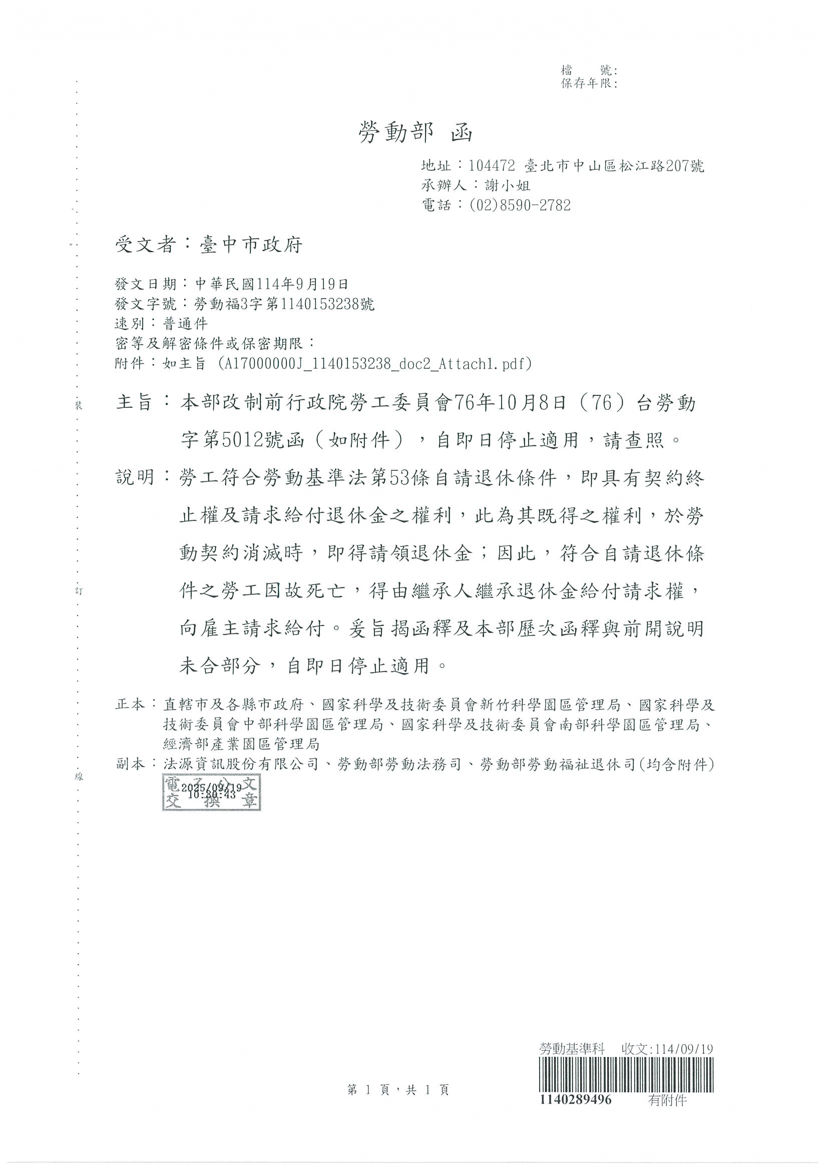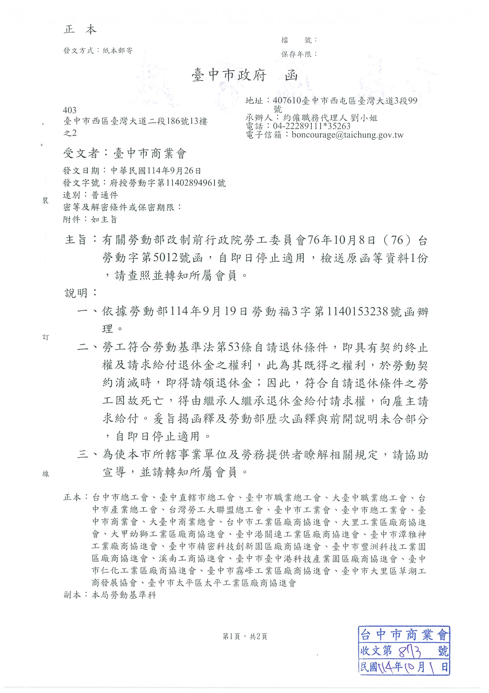 有關勞動部改制前行政院勞工委員會76年10月8日(76)台勞動字第5012號函解釋令