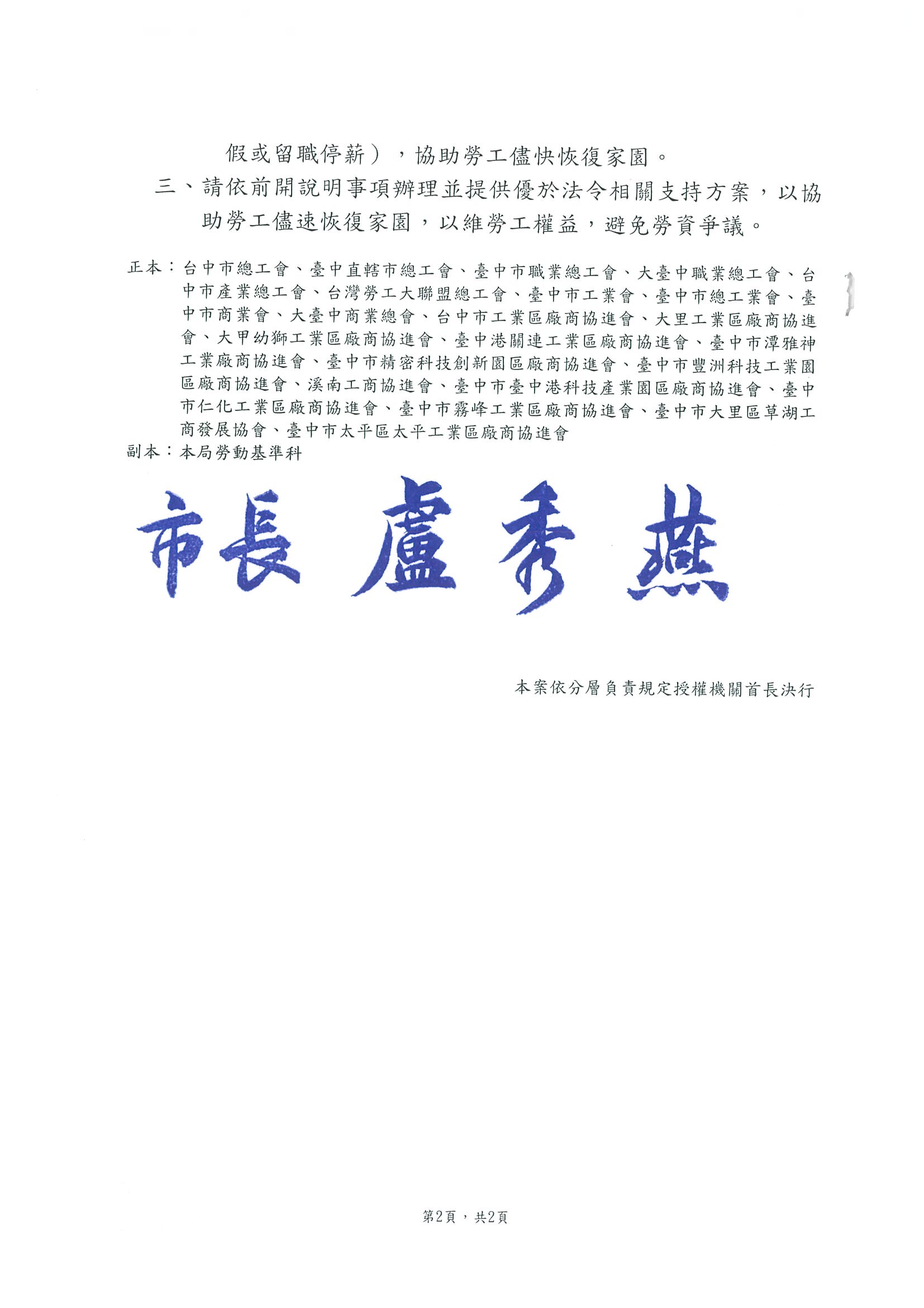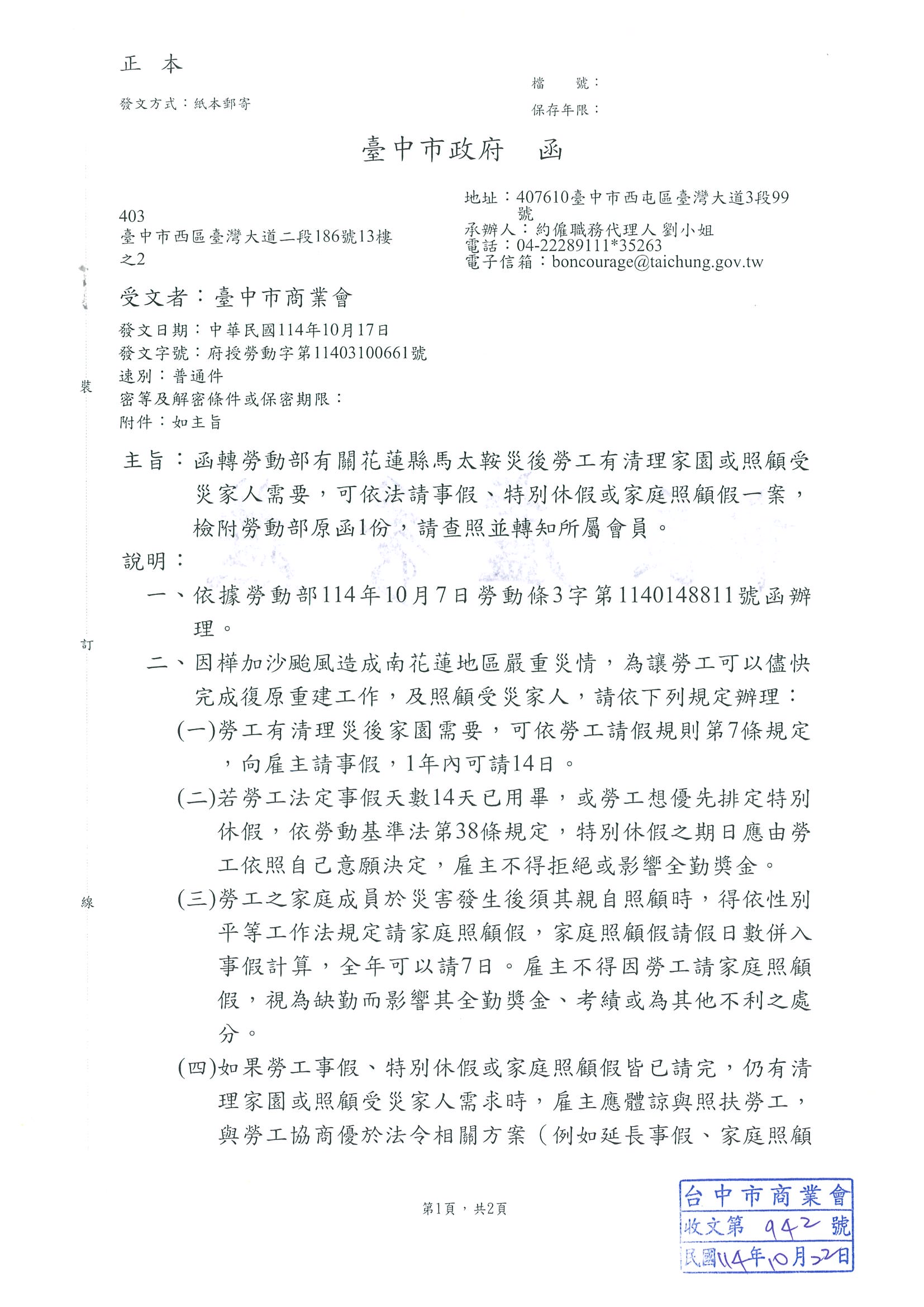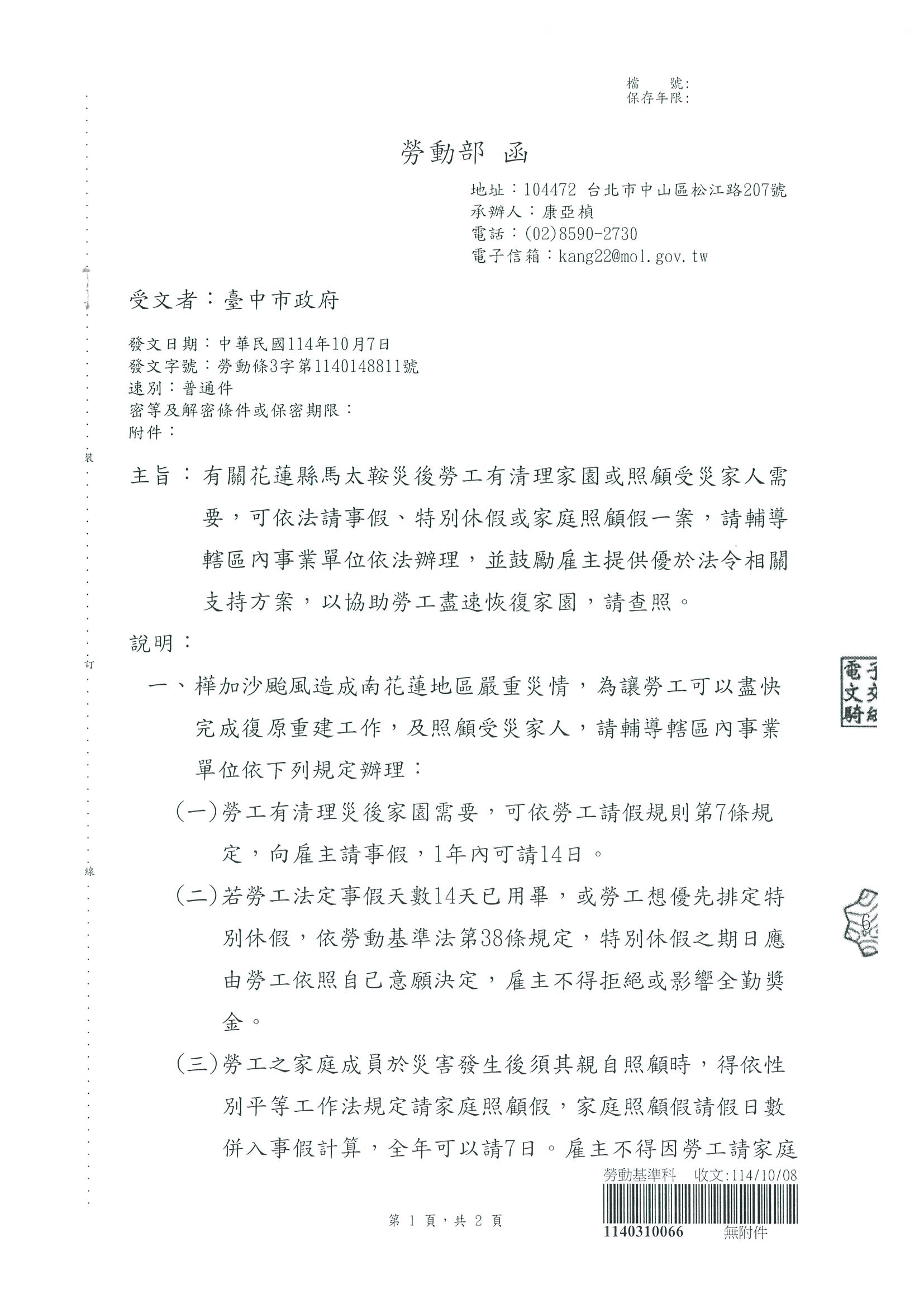 函轉勞動部有關花蓮縣馬太鞍災後勞工有關清理家園或照顧受災家人需要,相關請假解釋令