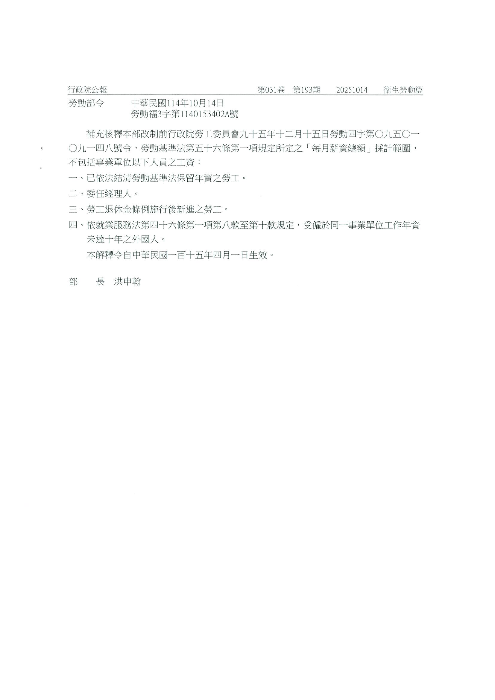有關勞動部改制前行政院勞工委員會95年1月4日勞動4字第0940073685號函,自115年4月1日停止適用