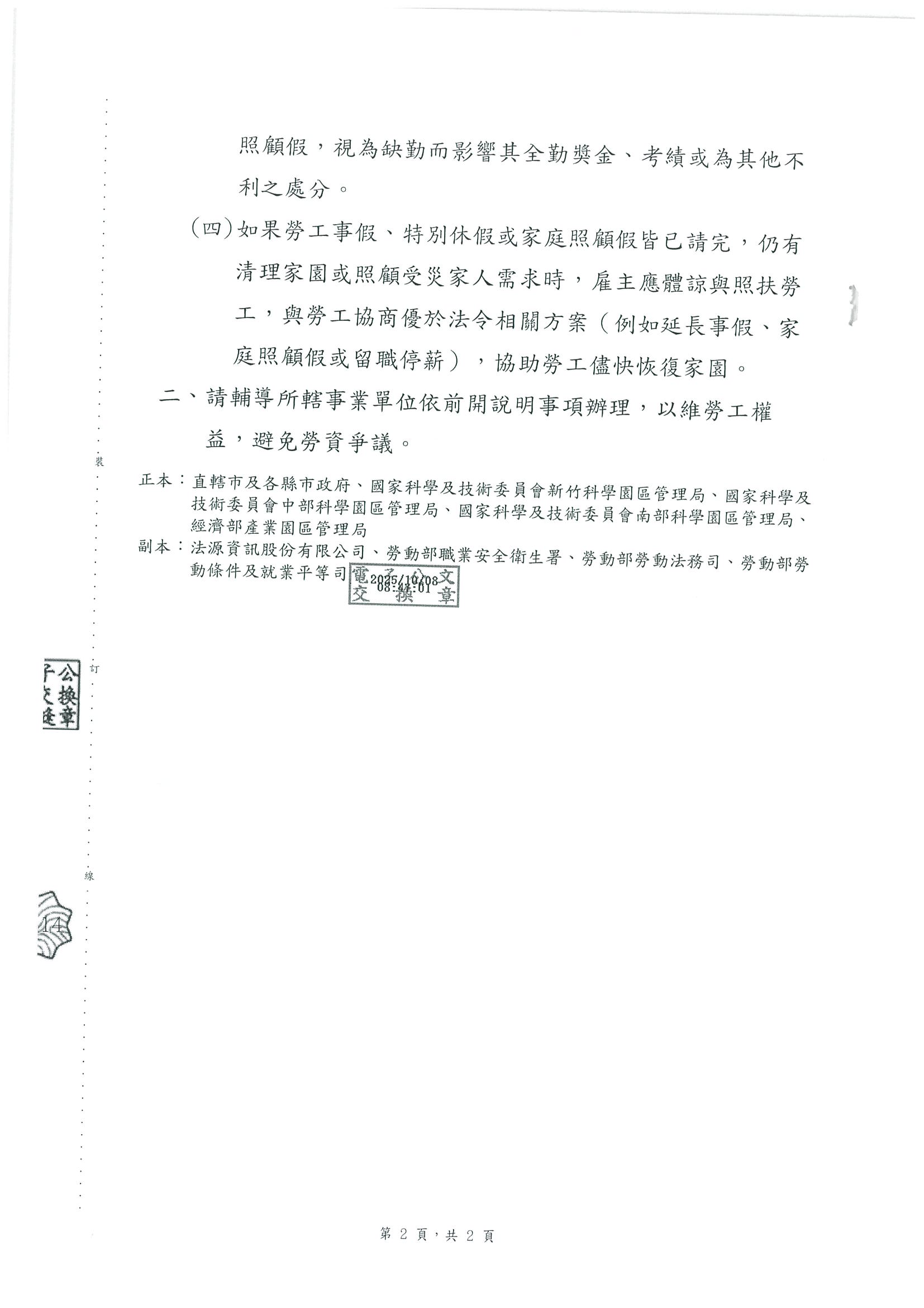 函轉勞動部有關花蓮縣馬太鞍災後勞工有關清理家園或照顧受災家人需要,相關請假解釋令