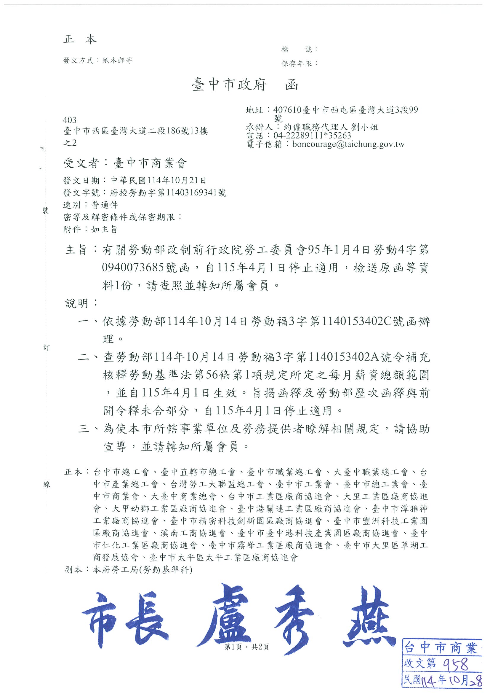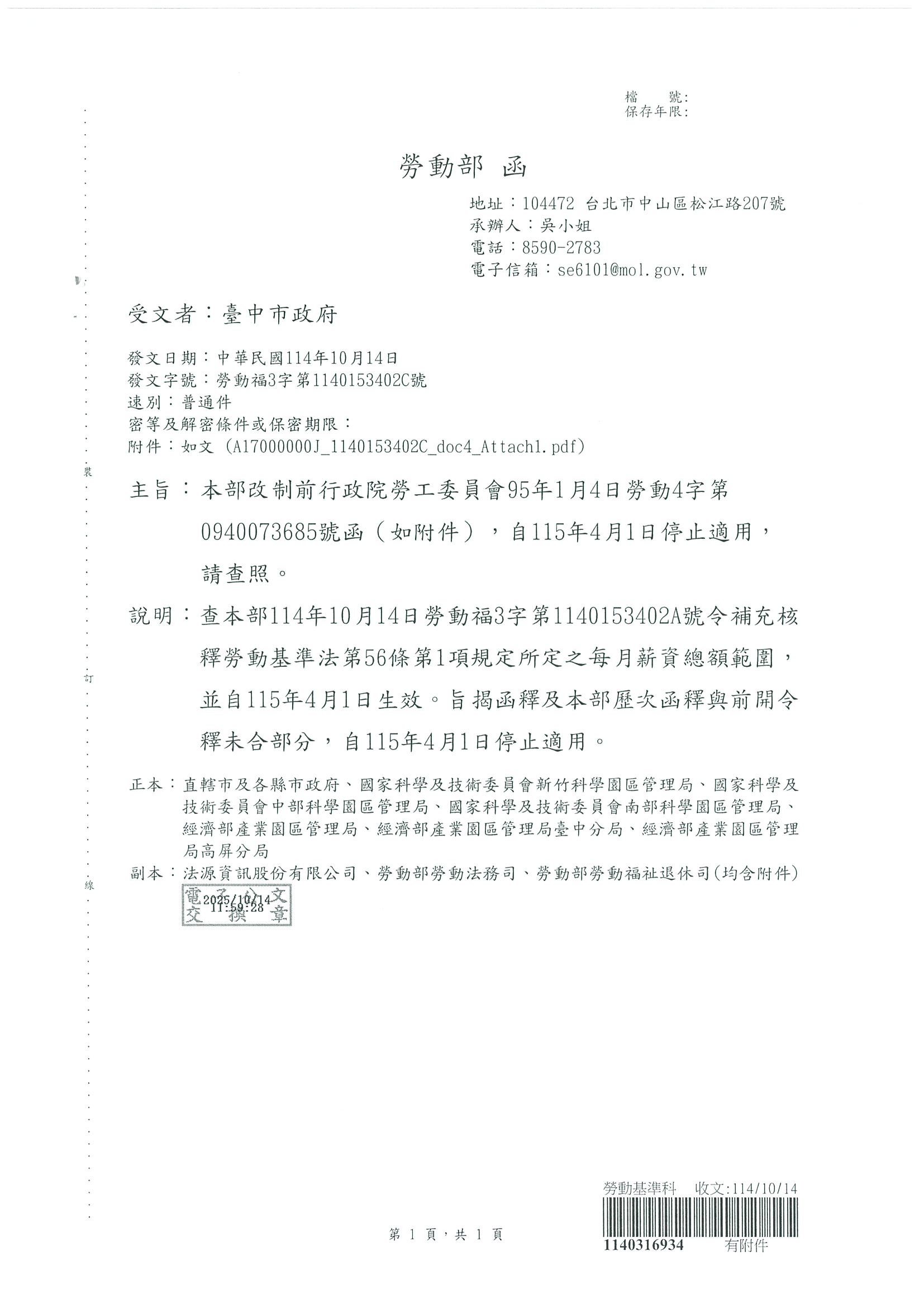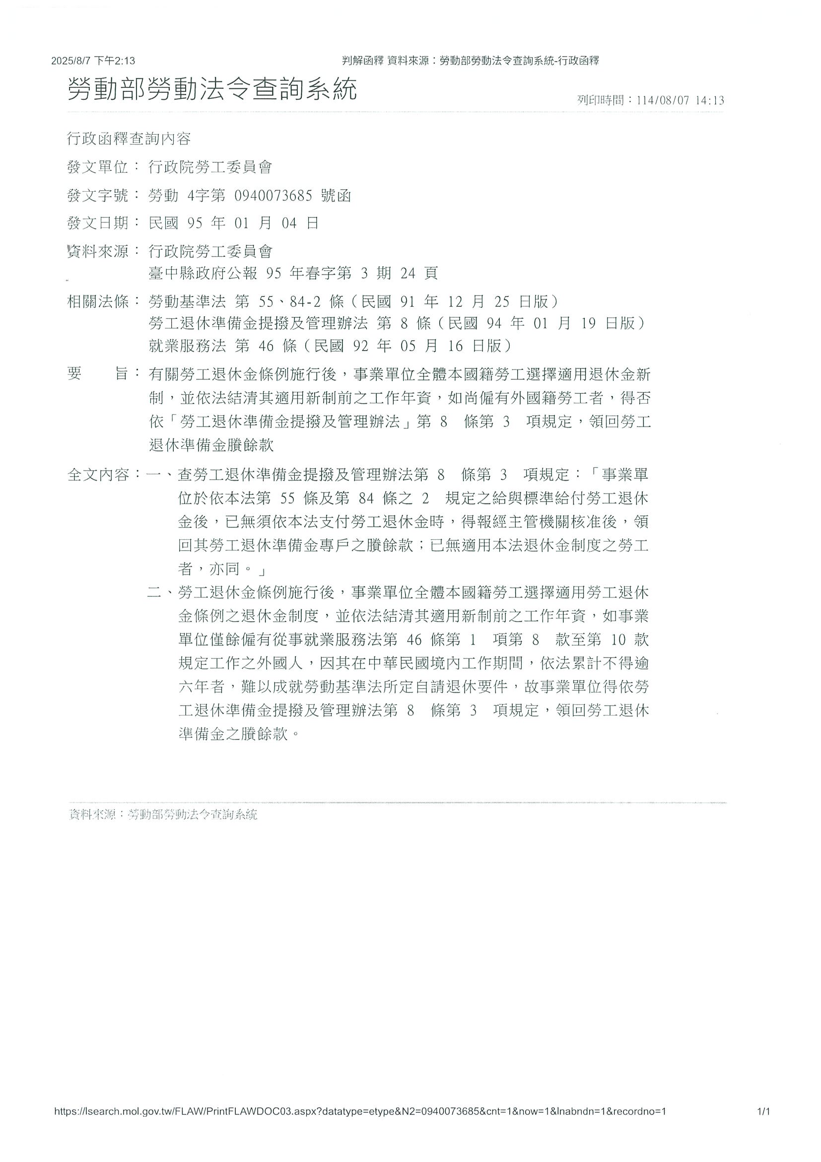 有關勞動部改制前行政院勞工委員會95年1月4日勞動4字第0940073685號函,自115年4月1日停止適用