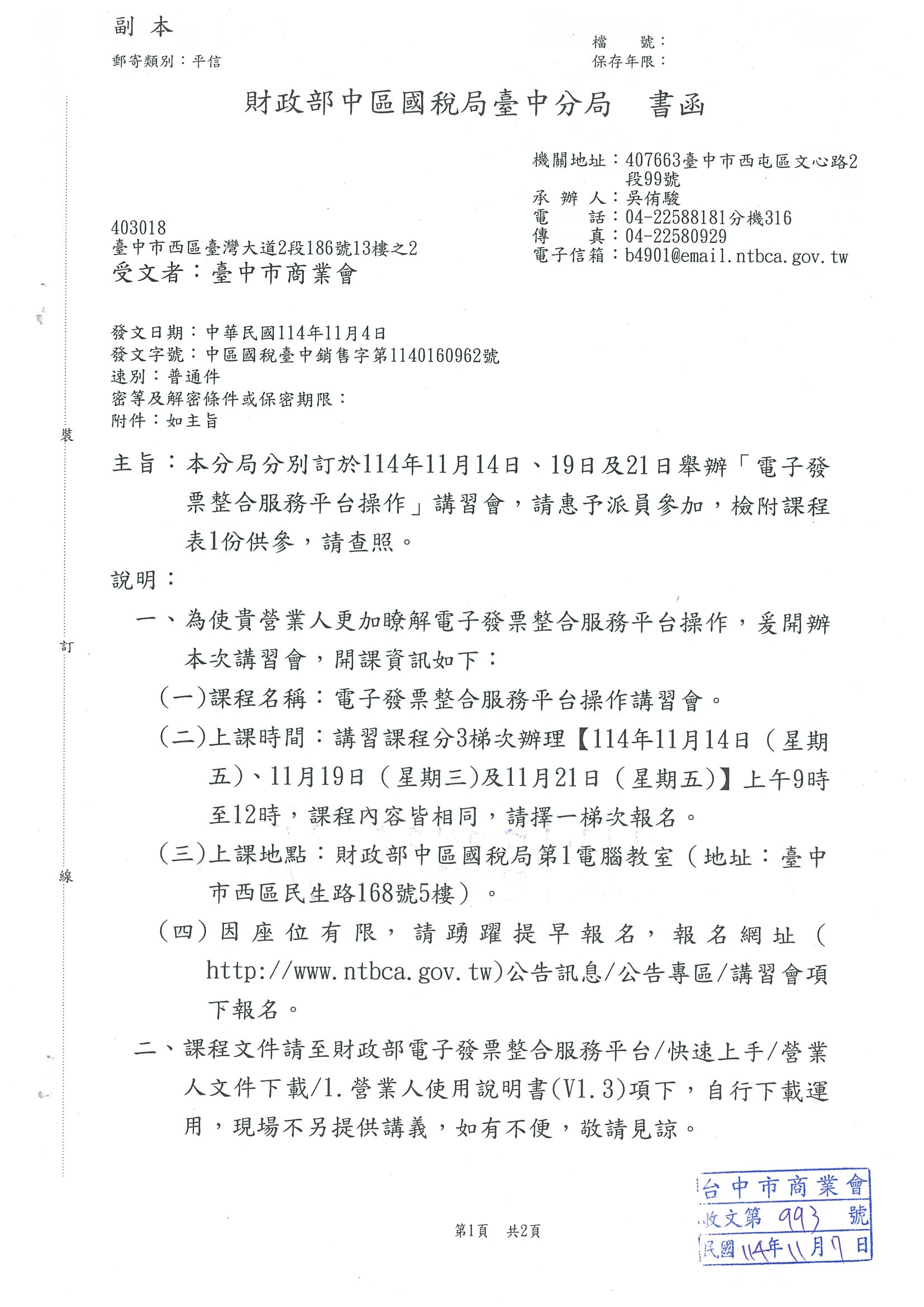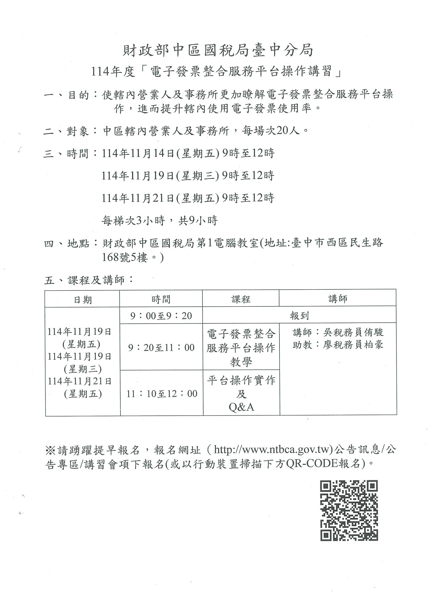 11月14日、19日、21日 財政部中區國稅臺中分局舉辦【電子發票整合服務平台操作】