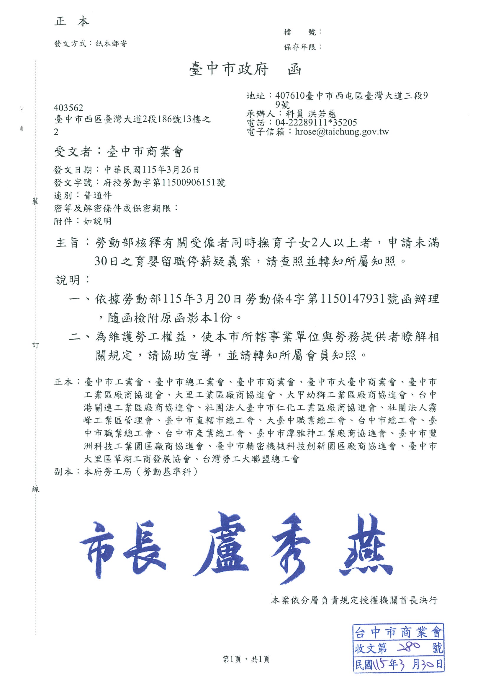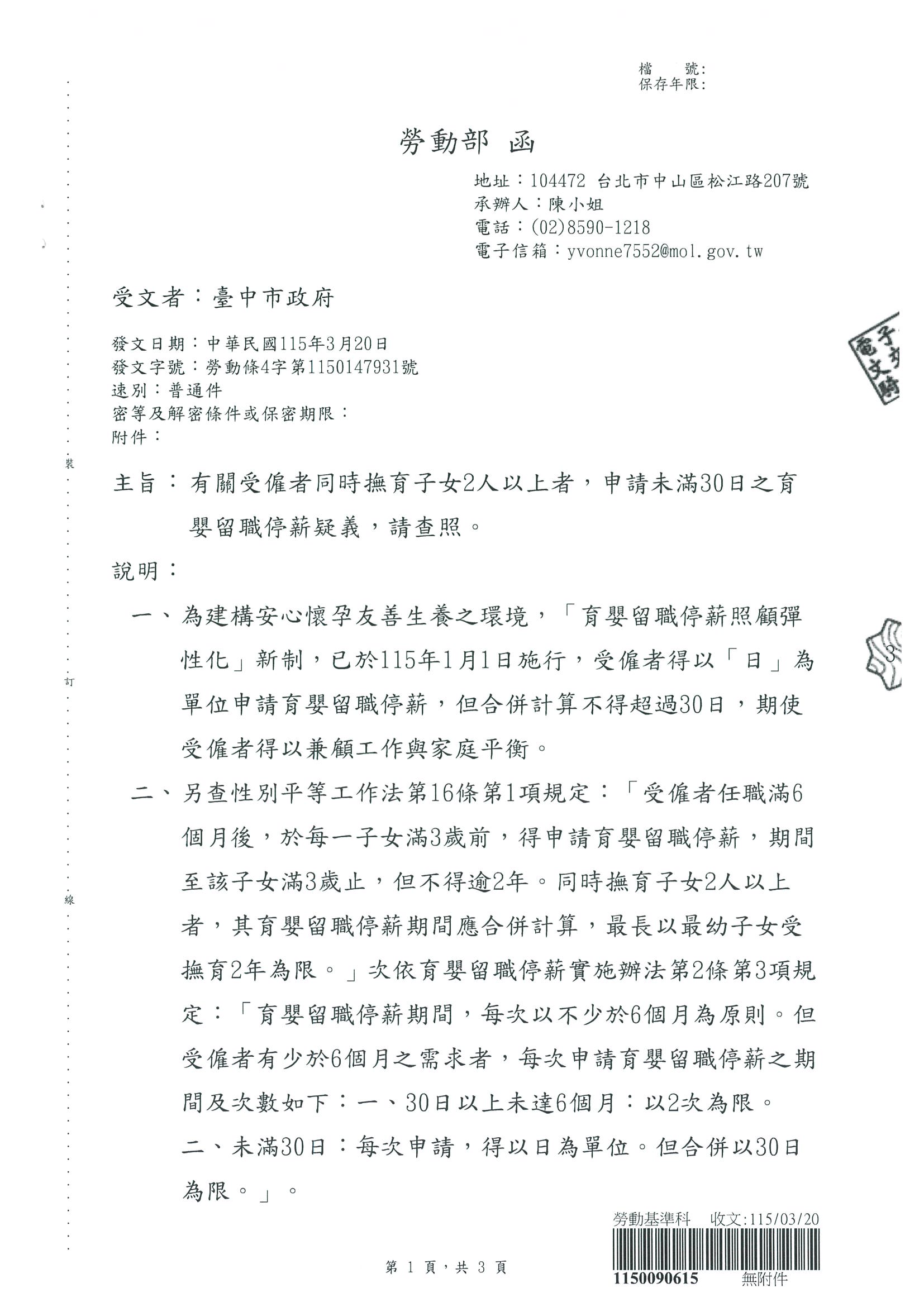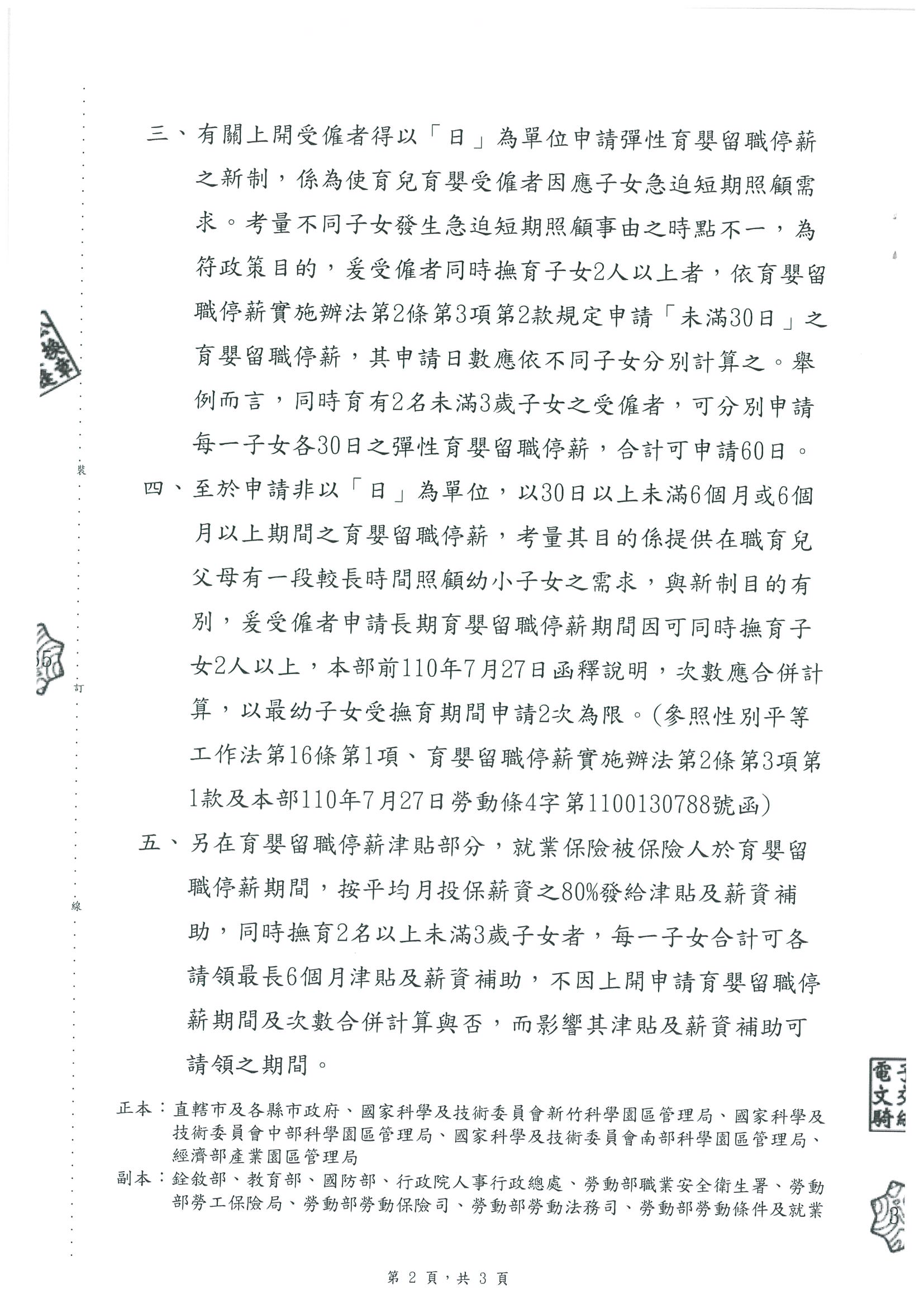 有關受僱者同時撫育子女2人以上者,申請育嬰留職解釋令