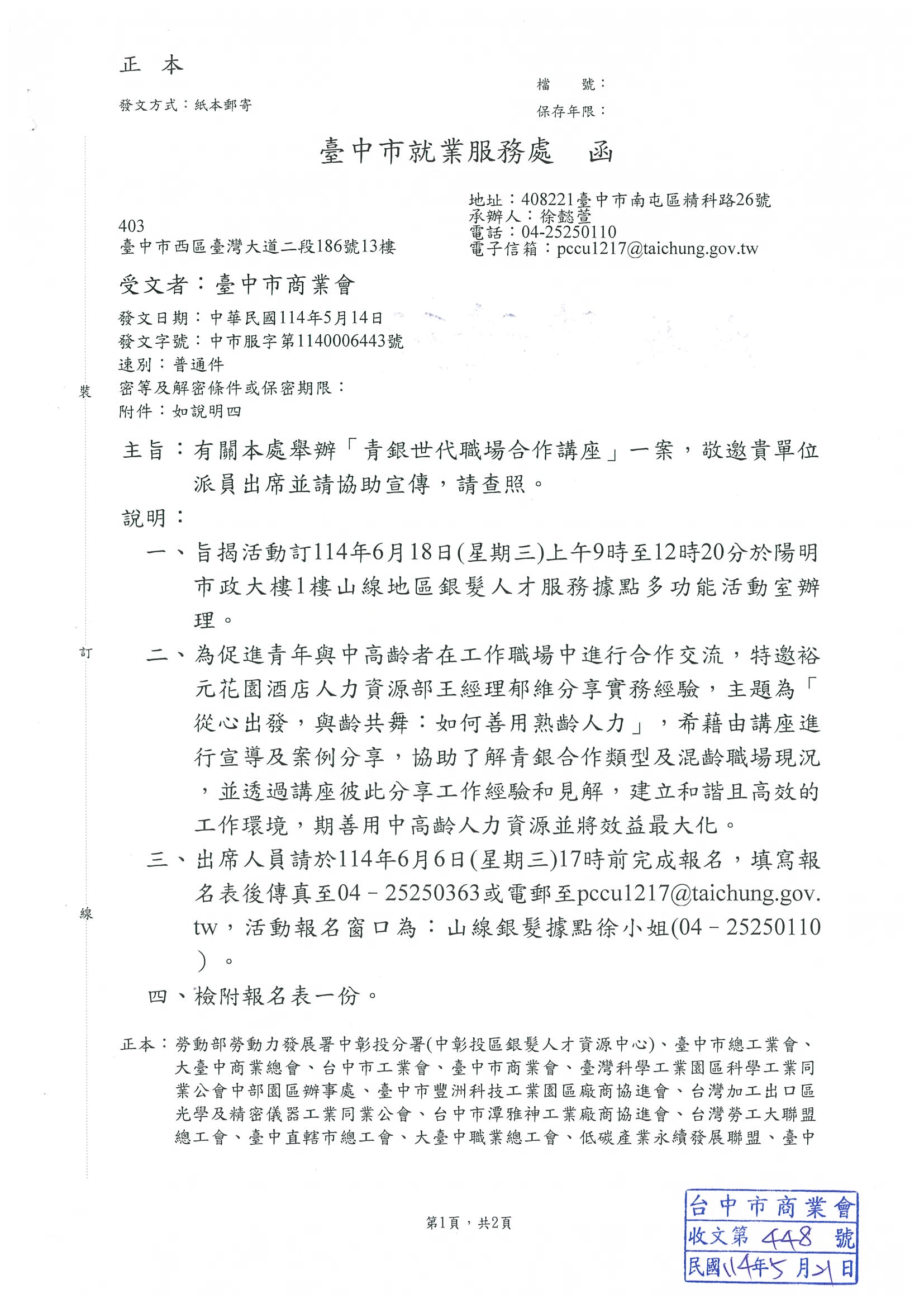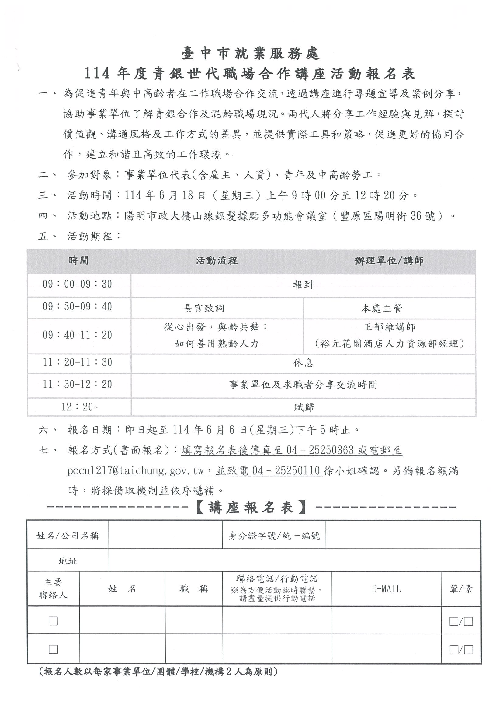 6月18日 臺中就業服務處舉辦[青銀世代職場合作講座]