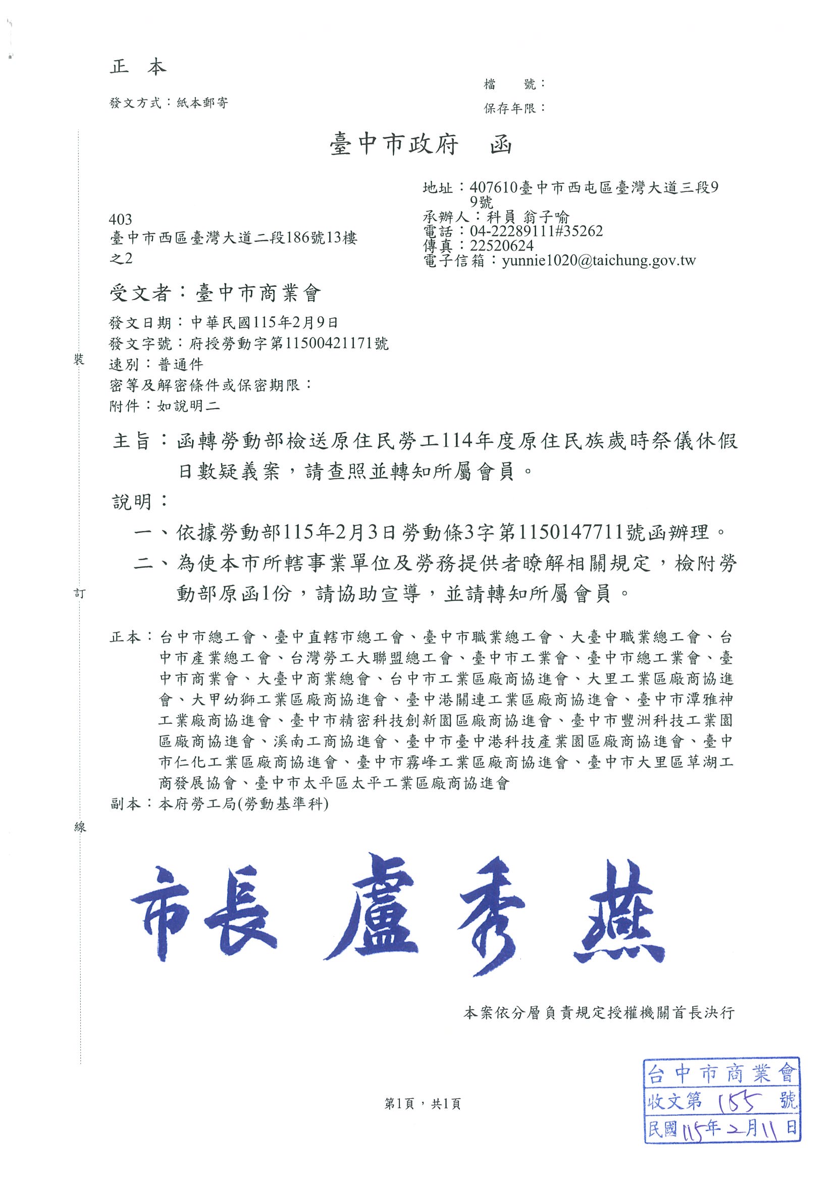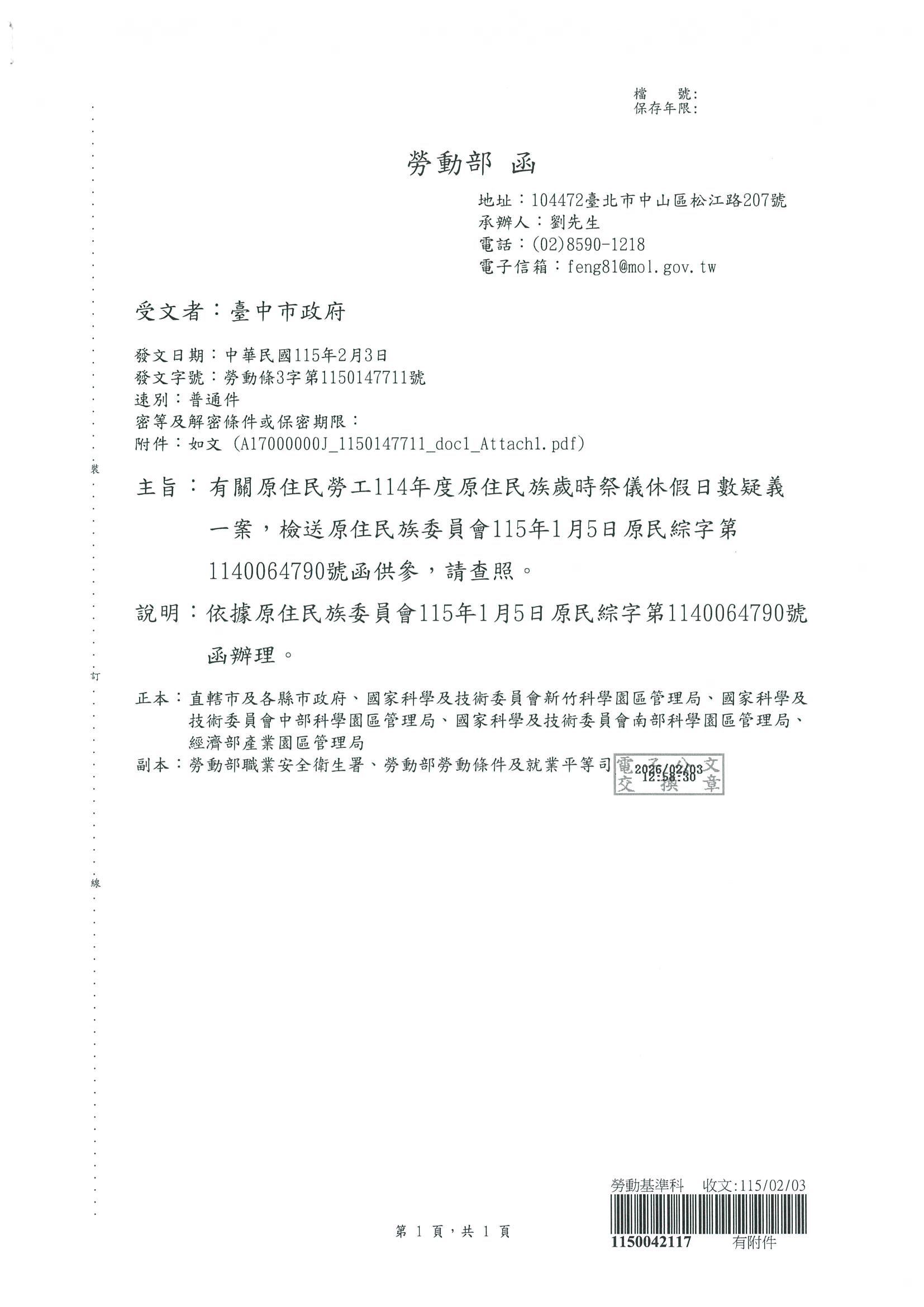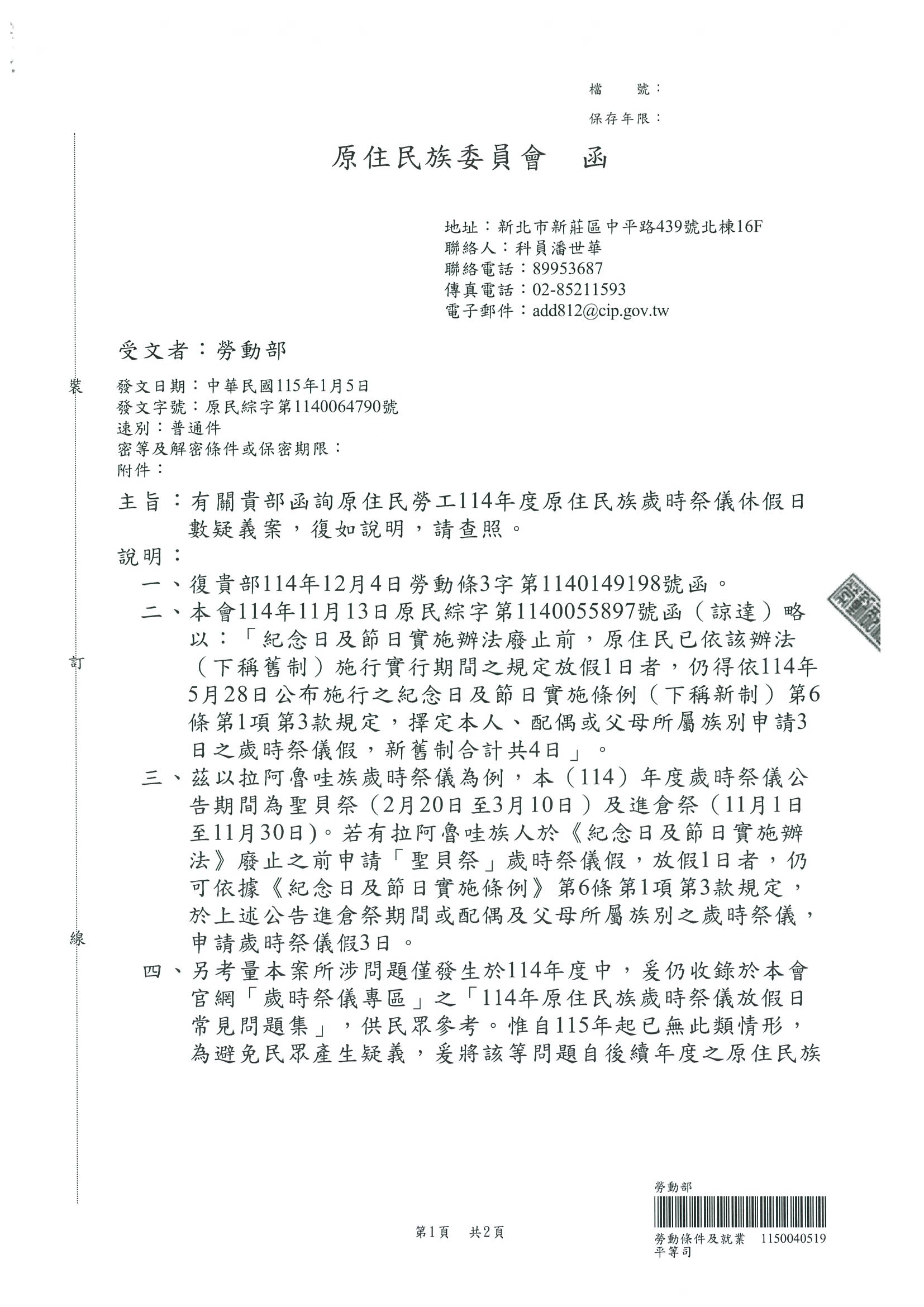 勞動部有關原住民勞工114年度原住民族歲時祭儀休假解釋令