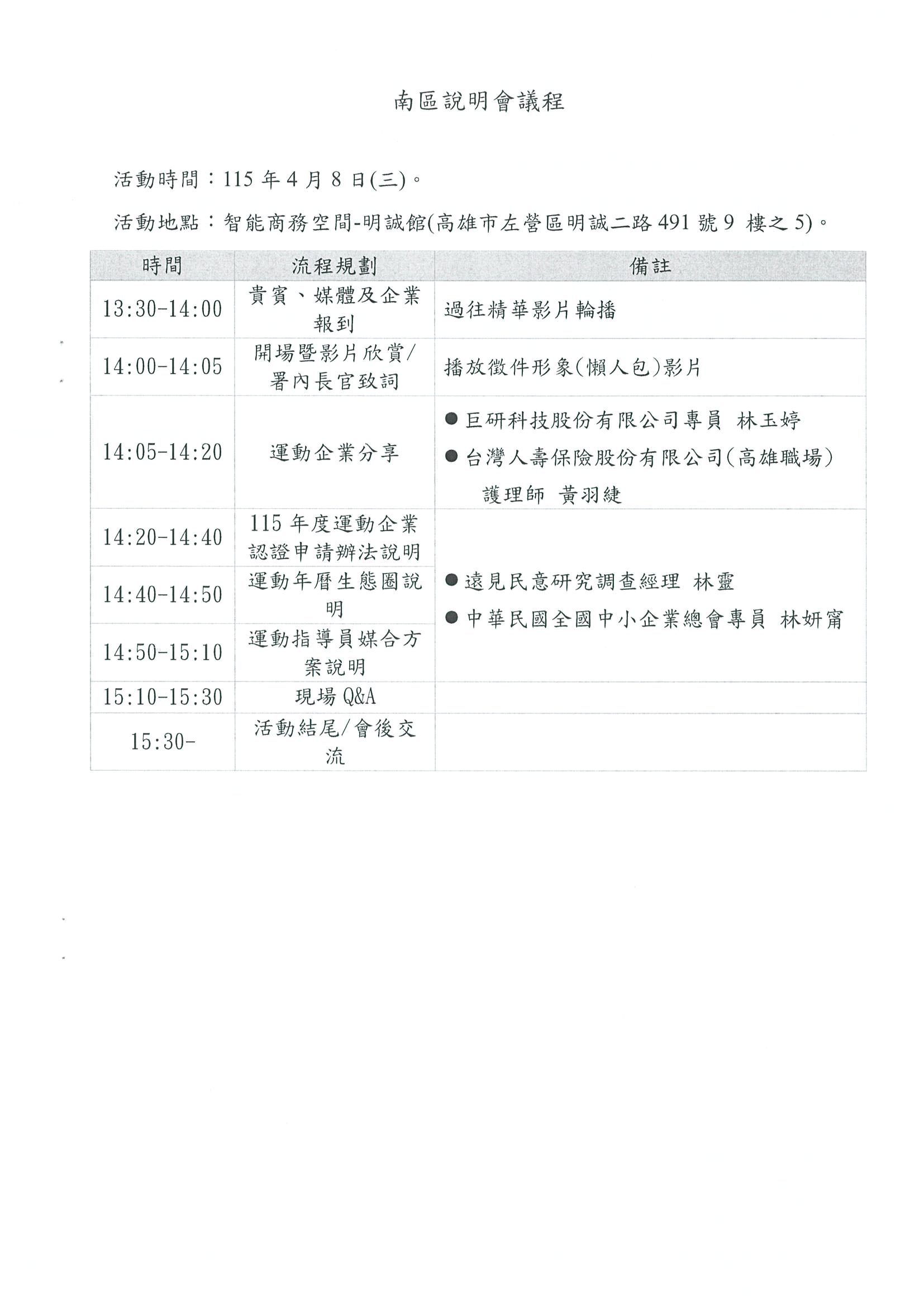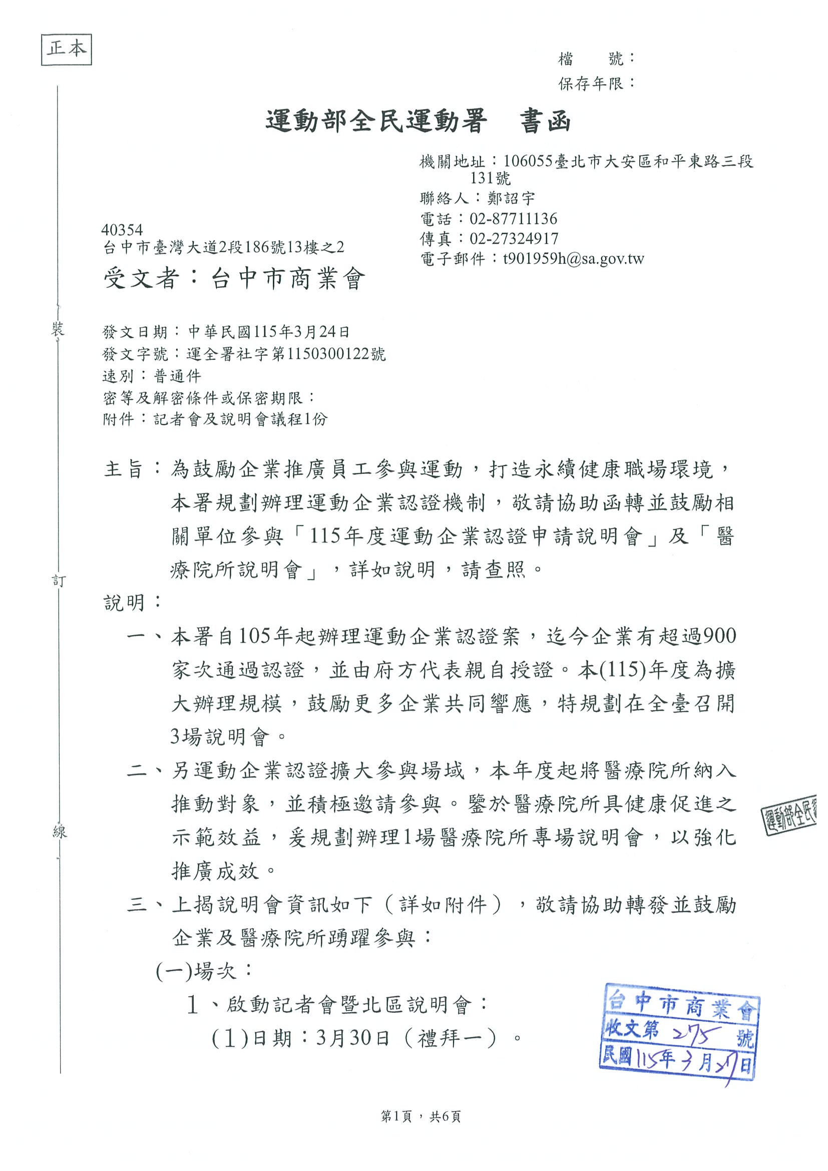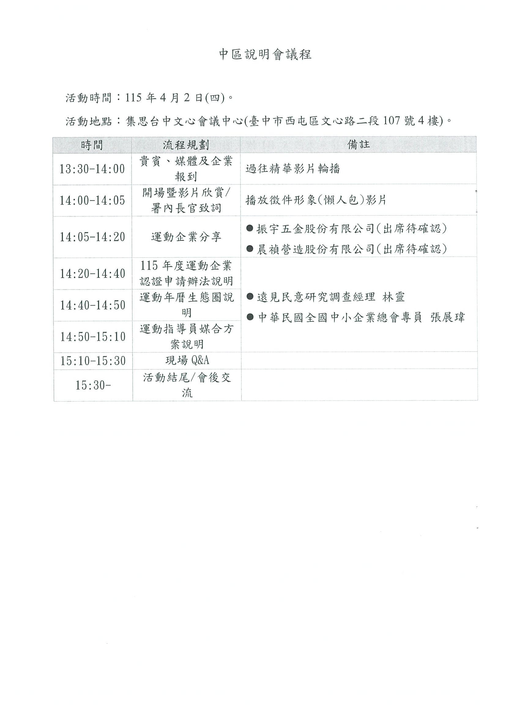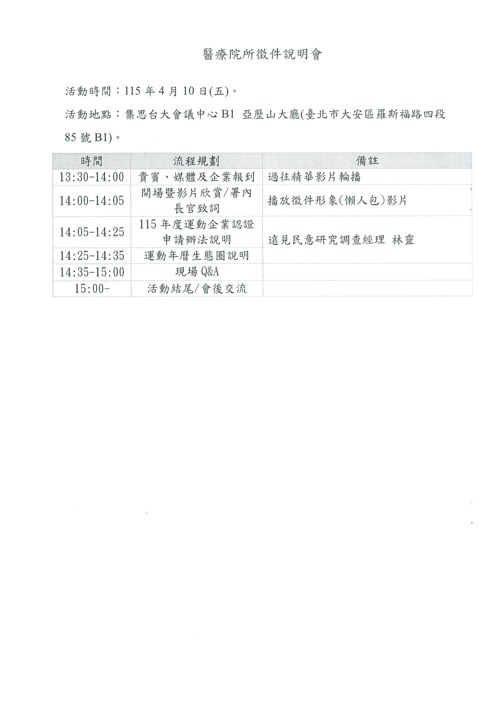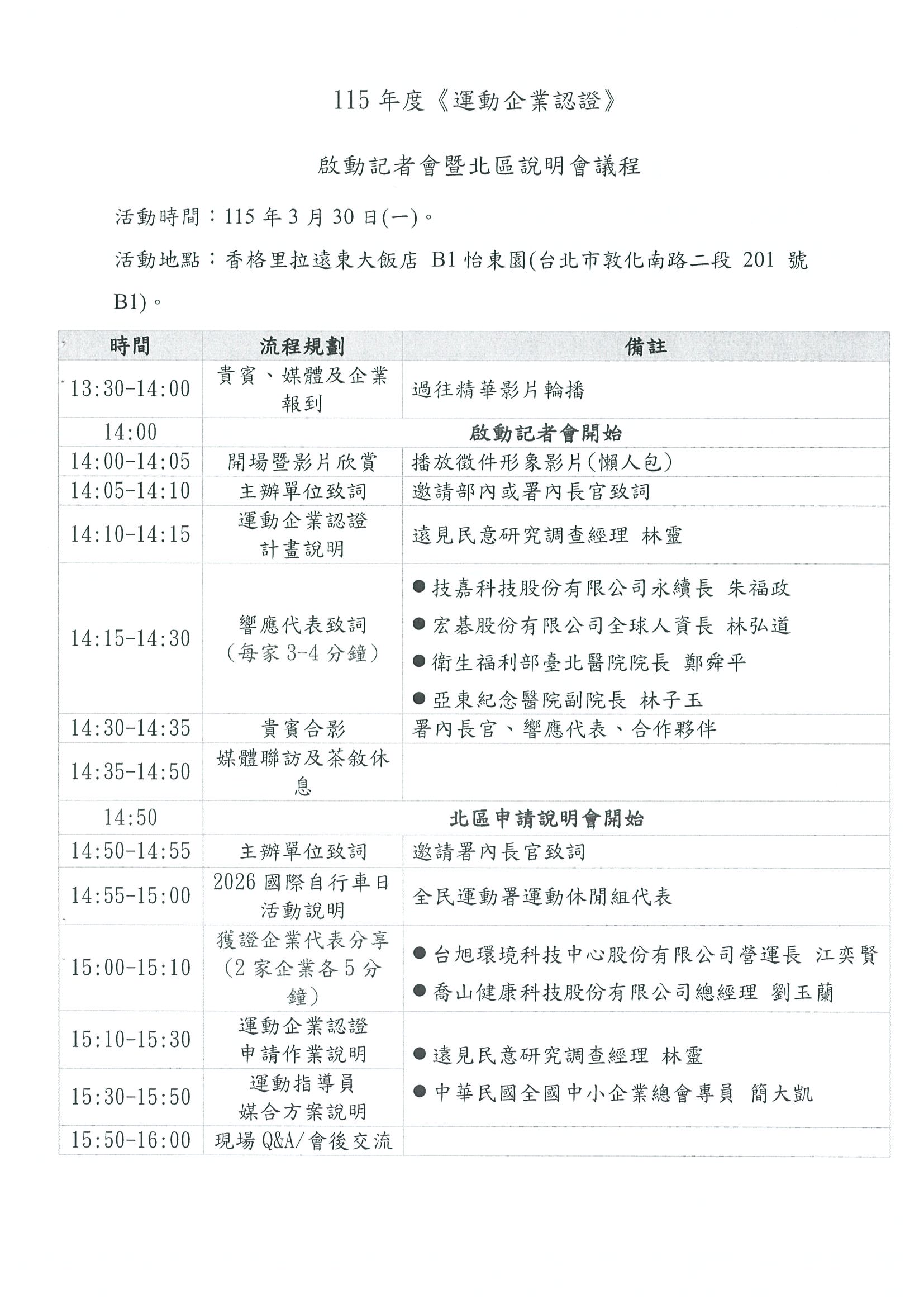4月2日 運動部全民運動署辦理【115年度運動企業認證申請說明會】及【醫療院所說明會】