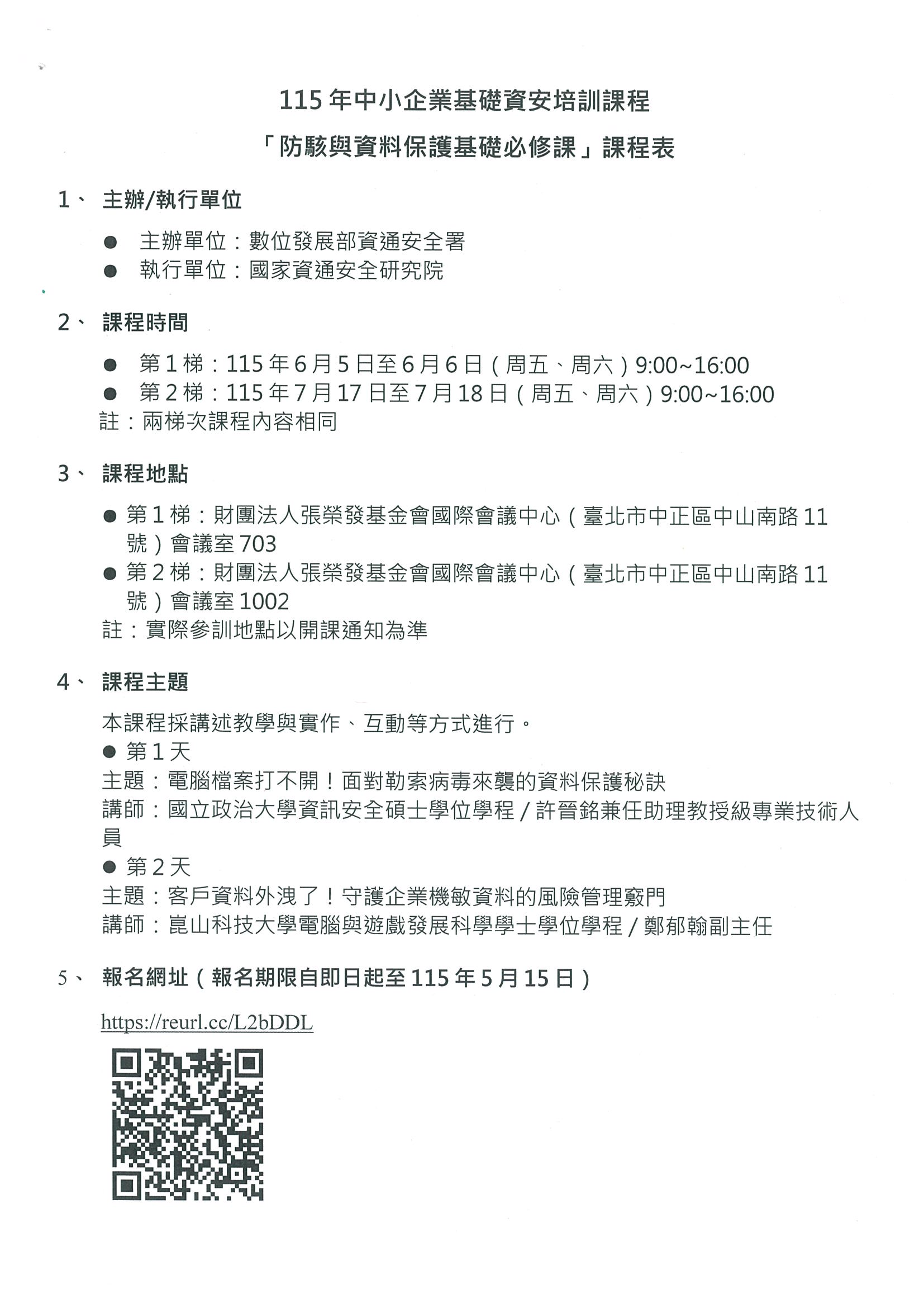 6月5-6日& 7月17-18日 數位發展部資通安全署【115年中小企業基礎資安培訓課程】