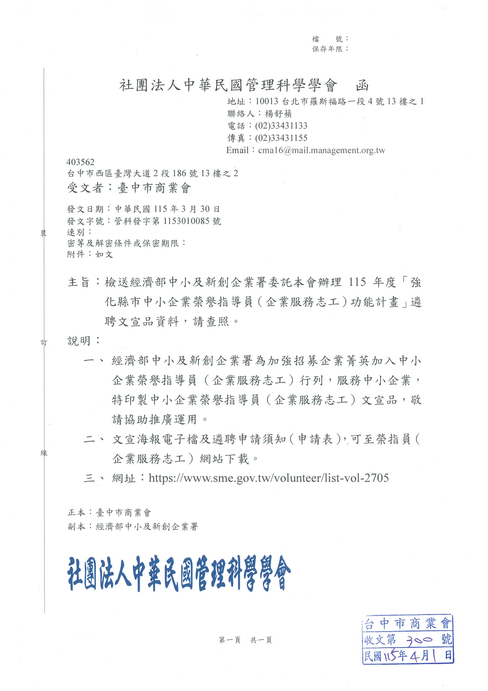 社團法人中華民國管理科學學會辧理[115年度強化縣市中小企業榮譽指導員功能計畫]遴聘文宣